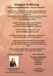 In diesem Workshop lernen wir die Siganale unseres Körpers kennen, befassen uns mit den Prinzipien einer intuitiven Ernährung und gehen in den Austausch.
